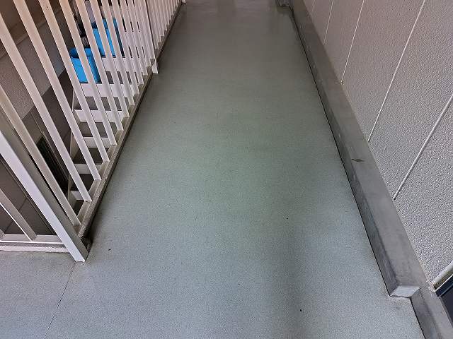 床材は、多くのマンション廊下で採用されている「長尺シート(塩ビシート)」です。今回は凹凸のないフラットなタイプです。